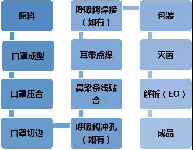半自動(dòng)的設(shè)備包括口罩成型機(jī)、口罩壓合機(jī)、口罩切邊機(jī)、呼吸閥沖孔機(jī)(若有呼吸閥)、鼻梁條線貼合機(jī)、耳帶點(diǎn)焊機(jī)、呼吸閥焊接機(jī)(若有呼吸閥)、包裝、滅菌、解析(EO)、成品。