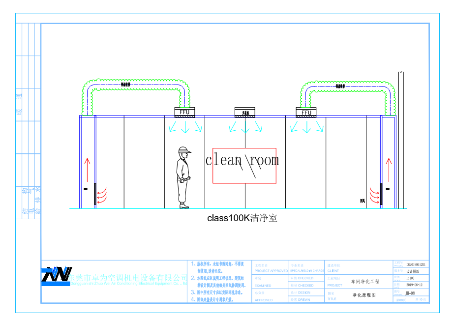 潔凈度的實(shí)現(xiàn)是通過(guò)布置在車間上的FFU高效過(guò)濾送風(fēng)單元過(guò)濾,足夠的換氣次數(shù)來(lái)實(shí)現(xiàn)的,新風(fēng)采用初效過(guò)濾后送入車間。
